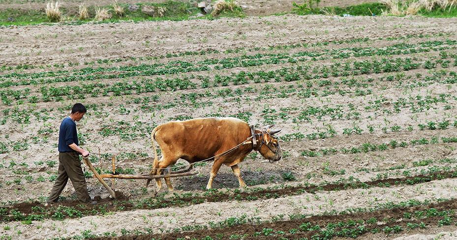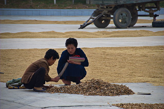 Manual threshing on a North Korean cooperative farm in 2015