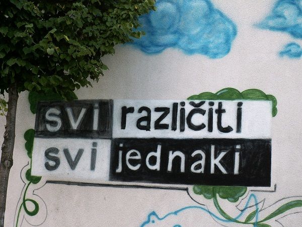 “All different–All equal” graffiti in Mostar, Bosnia and Herzegovina