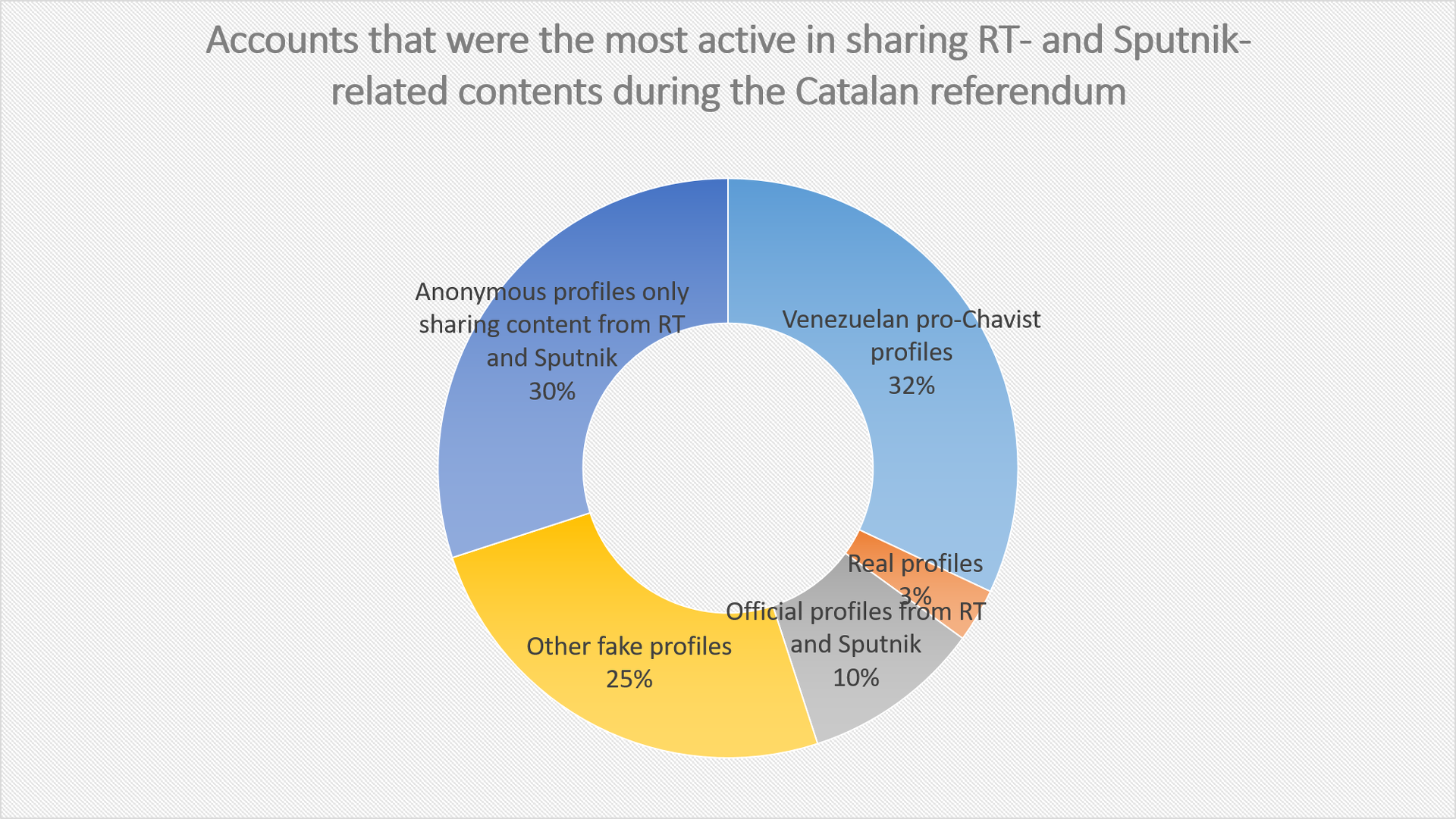 Evidently, no one can rightly state that these two persons acted on behalf of the Russians, but founded upon their earlier activity, one can assume that their deeds are not fully independent of Russian designs. Apart from them, pro-Russian accounts many times furthered news on Catalonia from other Western media outlets like InfoWars or The Drudge Report, too. Their activity was so overwhelming that evidence suggests pro-referendum sharing from these accounts saw a 2000% rise before the Catalan voting on 1 October. Interestingly, news on the Catalonian matter from Sputnik or RT were shared in a much higher proportion than those of many leading Spanish- and English-language news pages.