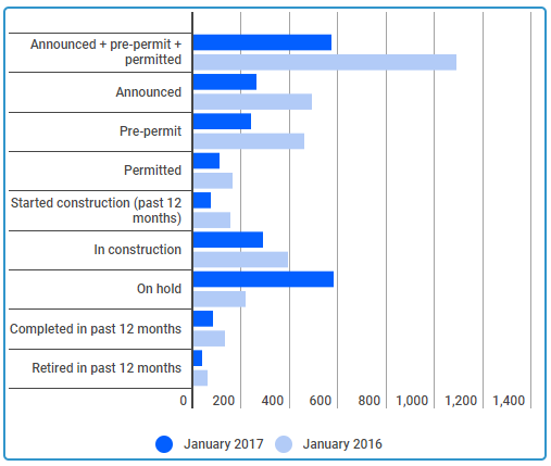 Coal-based power generation has declined heavily in the last few years in Europe and worldwide as well. Based on the study of CoalSwarm, Greenpeace USA and the Sierra Club, investments in coal plants reached their lowest level in 2016 due to policy shifts and the changing economic environment. The amount of planned coal power capacity in January 2017 was 570 GW, down from 1,090 GW a year earlier. With the decrease of coal-based power generation, the study does not exclude the possibility of reaching the 1.5 °C target set by the Paris Agreement, but also states that it would necessitate a more rapid retirement of currently operating units. In total, 64 GW of coal capacity was retired last year, mainly in the US and EU.
