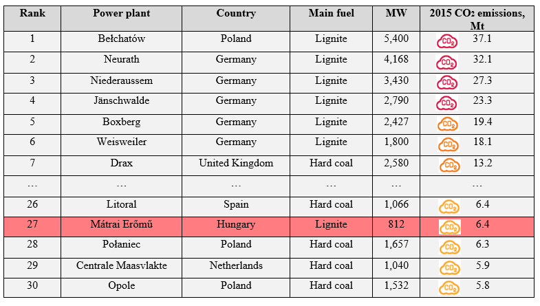 In Hungary, the facility most affected by the new act is the Mátra Power Plant, one of the most polluting facilities in the EU. The plant—which was built between 1965 and 1973—has five lignite units with a combined capacity of 884 MW and two gas-fired power generation units with a capacity of 33 MW each, producing 13% of the Hungarian electricity consumption. Based on the findings of Europe’s Dark Cloud 2016 study, the strategic Hungarian power plant emits 6.4 Mt carbon dioxide yearly, placing it 27th in the ranking of the most polluting facilities. The Polish (37 Mt) and German (32 Mt) power plants top the list with emissions that almost equal the annual Hungarian carbon dioxide emission. It is also worth mentioning that three countries alone are home to 19 of the ‘Dirty 30’ plants: Germany, Poland, and the United Kingdom.