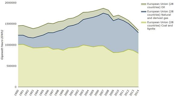 Gross electricity production by fuel type (dark grey: EU28 oil; blue: EU28 natural gas and other gas; light gray: EU-28 carbon and lignite)
