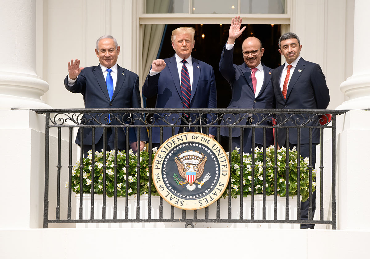 Benjamin Netanyahu in the White House, signing the Abraham Accords on 15 September 2020
