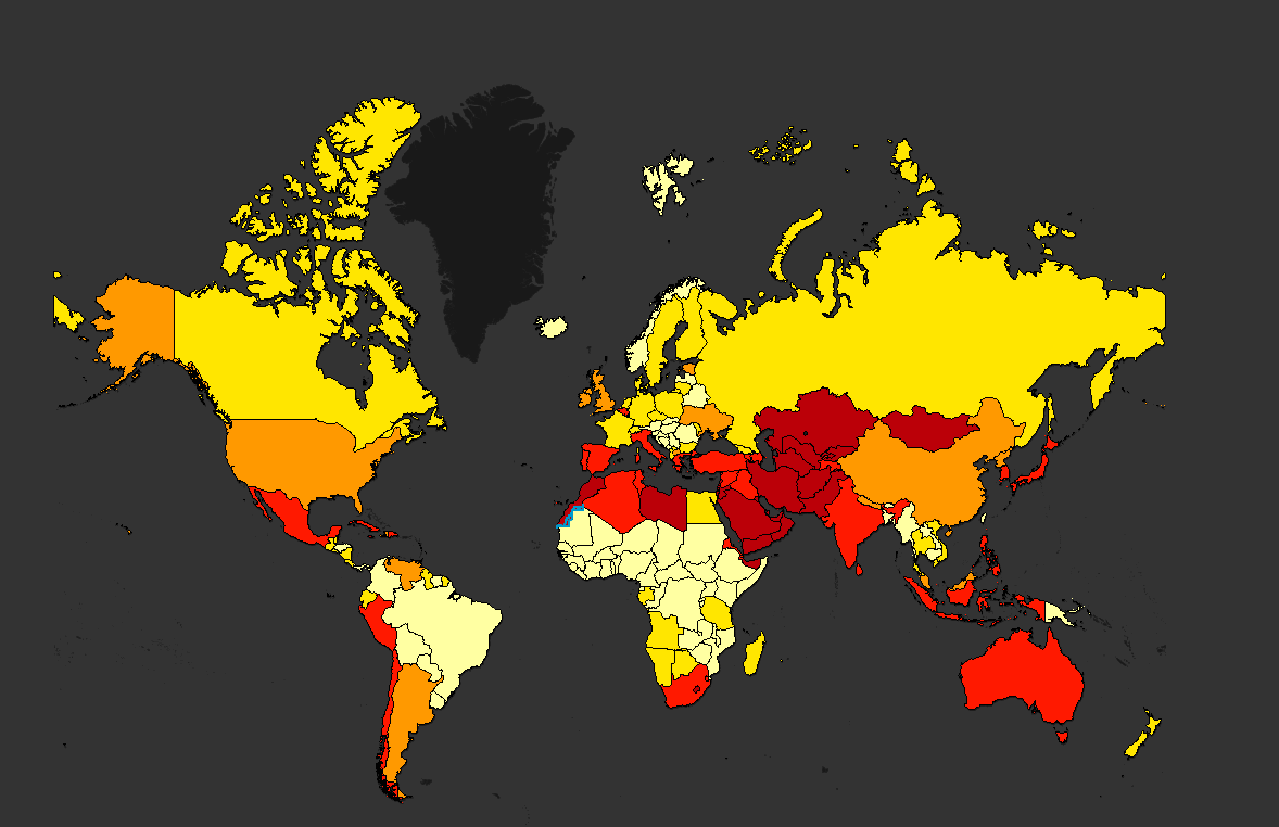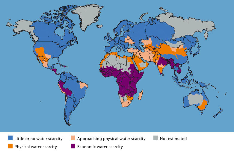 The exposure of people in each country to water stress shown in the ratio of total withdrawals to total renewable supply per year (purple: >80%, red: 40–80%, orange: 20-40%, yellow: 10–20%, pastel yellow: <10%)
