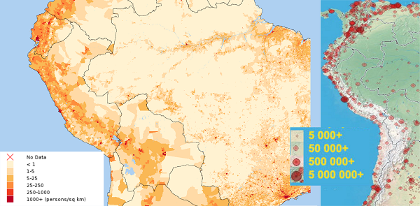 As demonstrated by the next map, the population of this specific region also follows the lines of the cordillera. This means that, while population density is higher on the eastern and western side of the Andes and particularly in the region between the western slopes and the Pacific, in the other parts of Bolivia and Peru it is lower. Therefore, there is significant correlation between areas with more people per square meter and those threatened by water scarcity.