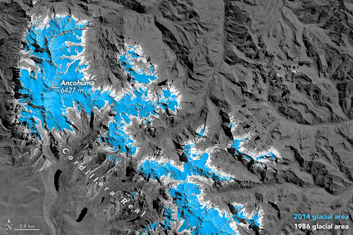 An example of glacier recession in the Andes (white represents glacier extension in 1986, blue in 2014)