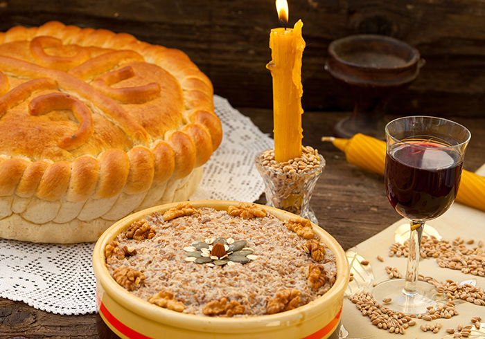Slava is an important holiday in family life and is celebrated among friends as well. On the day of the patron saint, the family usually goes to church service where the priest blesses their slava-cake (a special bread made for this occasion) and the so-called koliva which is a dish of minced boiled wheat. These are the main meals served for Slava that have a symbolic meaning: the bread and wine represent the body and blood of Christ, whilst koliva represents resurrection and eternal life. The host, within prayers and in presence of the rest of the household, lights the slava candle which stands at the dining table during the festive meal. Habits for Slava differ from one community to another. In some cases the priest comes to the household, blesses the house and the meals prepared, and in some more traditional communities the cake is made with holy water and decorated with prosphora seal or some other shapes. On the family patron saint’s day, the door of the household is open to everyone. Relatives and friends visit each other, so it often happens that the celebrating house is crowded with guests during the entire day. It is customary that the guests bring a bottle of red wine and say My host, I wish you happy Slava! (Srećna slava domaćine!) greeting at the entrance door where the host and his wife await them with red wine and koliva.