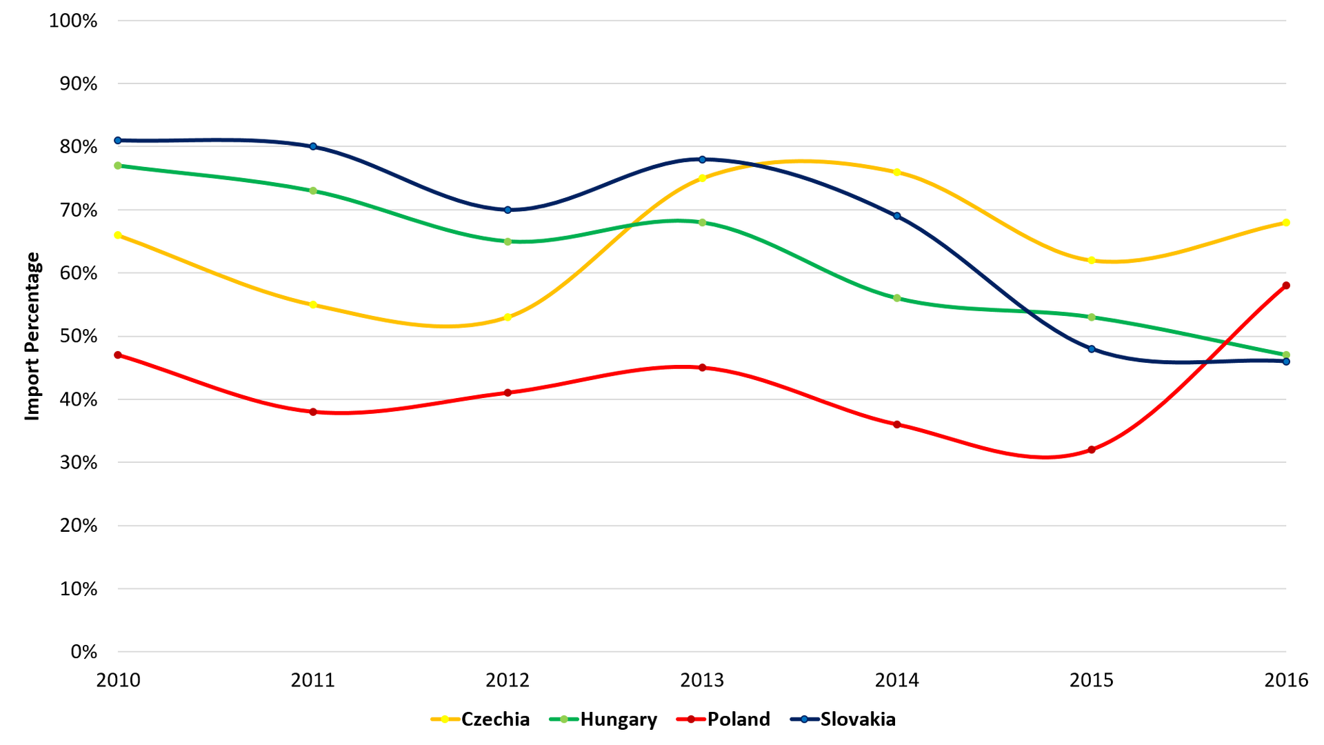 Russian Share of V4 Natural Gas Imports (2010–2016)