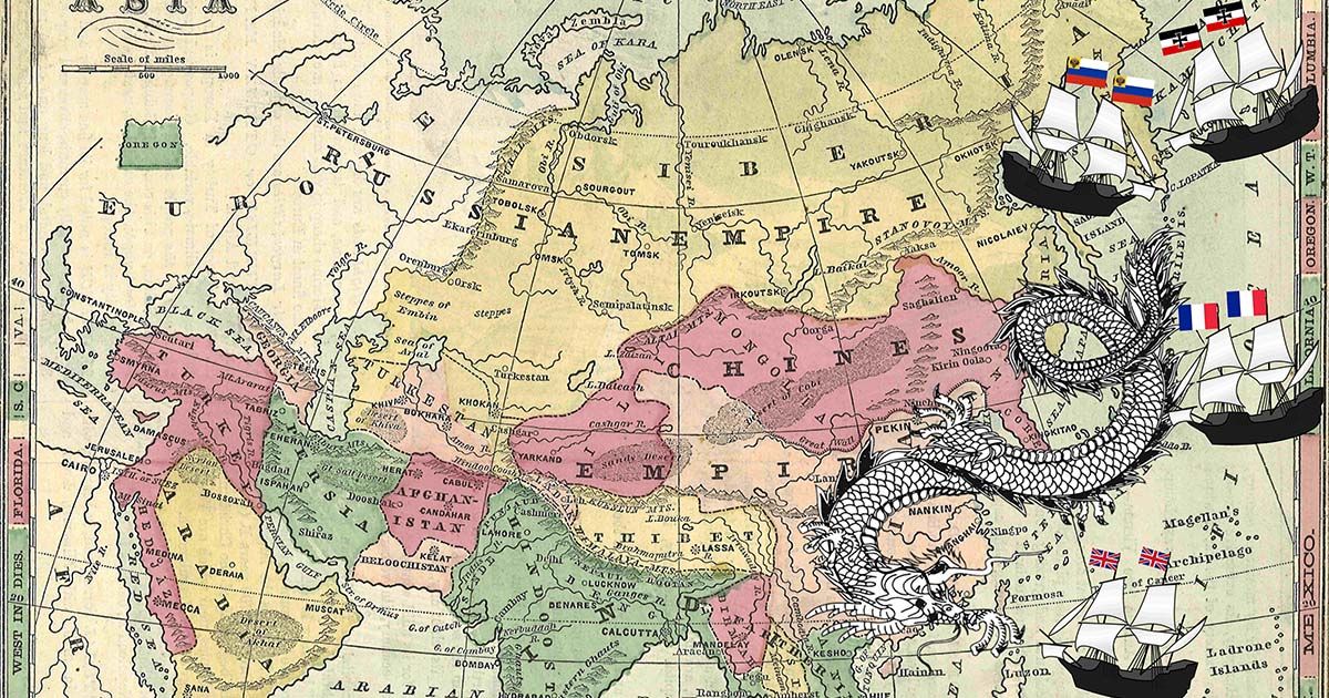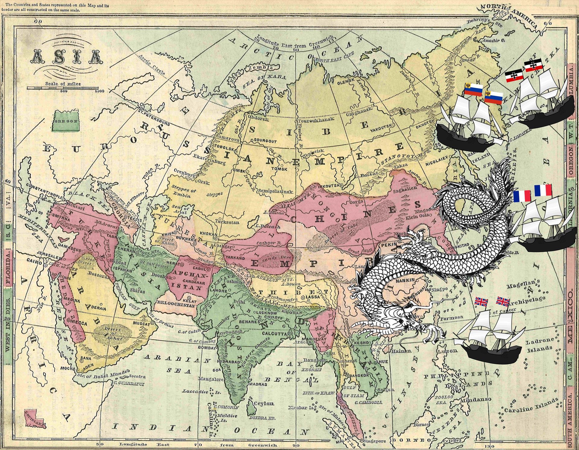 Design by AJKC Research using the following elements: Dragon (design by OpenClipart-Vectors), Asia 1870s Map (taken by James Monteith), SailingShip (design by Con-struct), Flag of German Empire (design by Jwnabd), Flag of Russian Empire (design by TRAJAN 117).