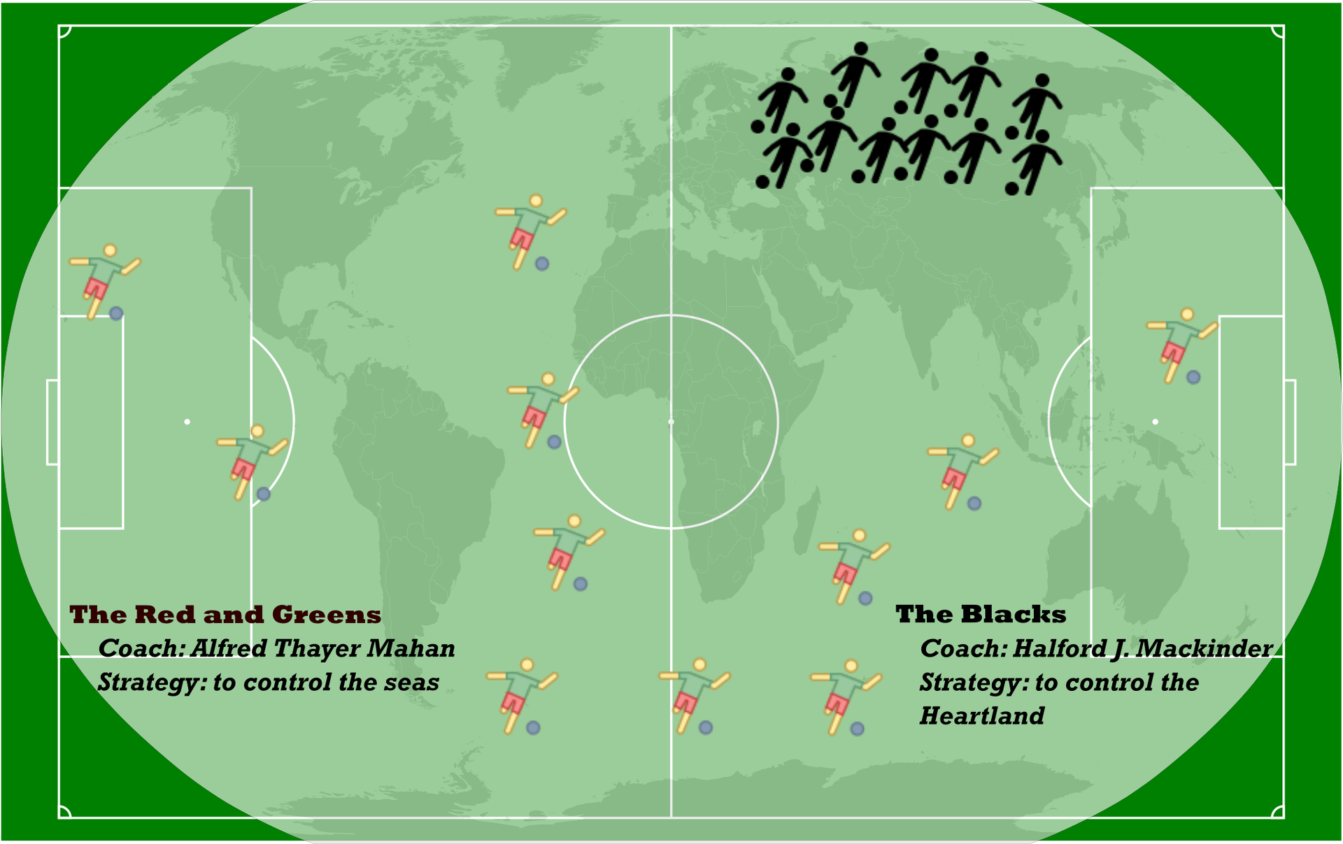 In soccer, the starting formation of a team and a clear strategy greatly influence the outcome of the match. They help determine whether the team will attempt to overcome its opponent by holding onto the ball and controlling the field, or by relying on surprising and dynamic counterattacks and defense. Whichever strategy a team chooses to go with, the ultimate aim is to utilize the field to the best of its abilities. This success-oriented usage of the playing field can easily be compared to the geostrategic ideas of Anglo-Saxon thinkers in the late 19th and 20th century.