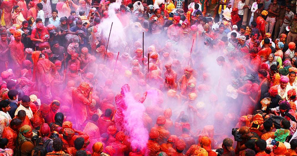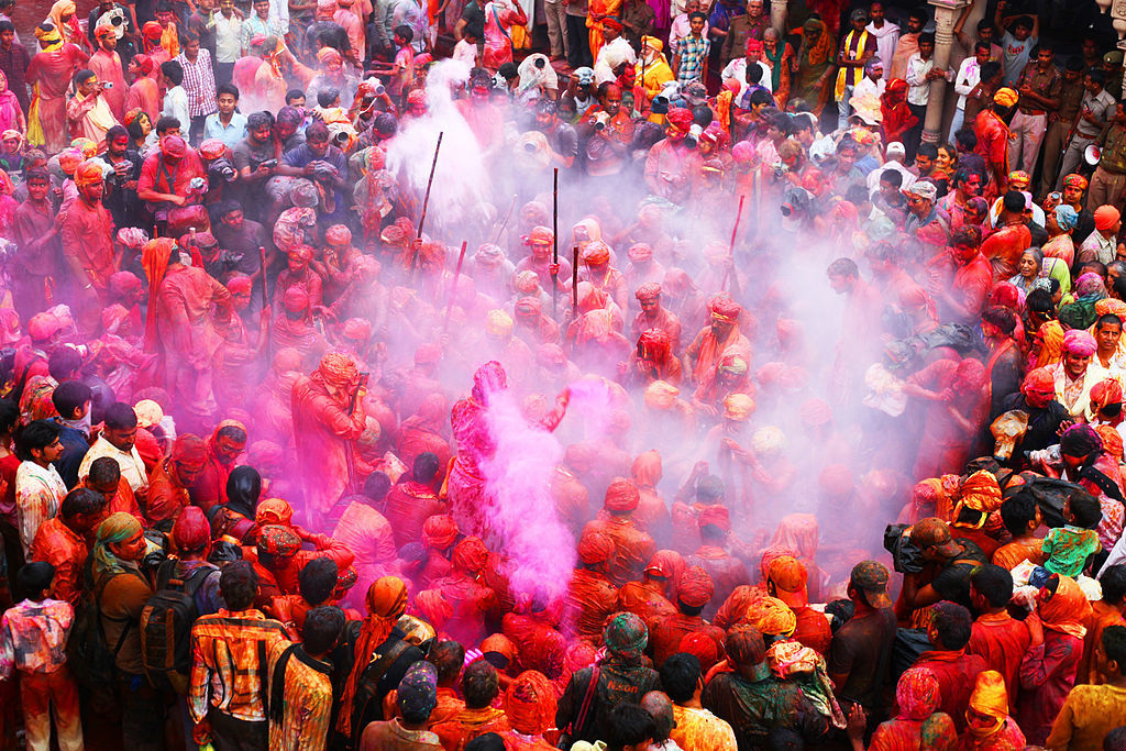 Holi-fesztivál ünneplése a jellegzetes festékszórással. Barszana, U.P., India.