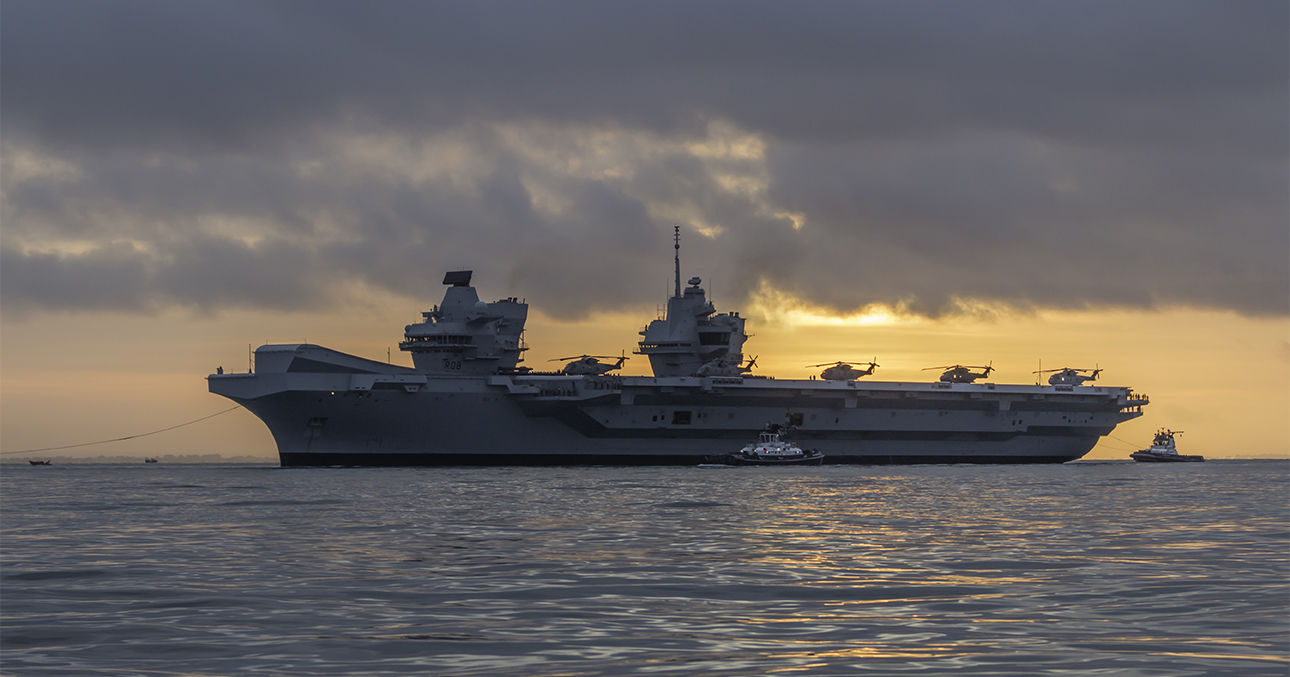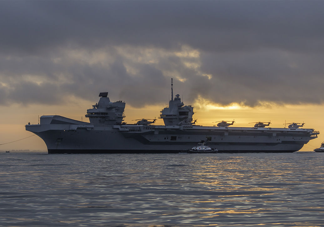 A HMS Queen Elizabeth elhagyja Portsmouth kikötőjét a naplementében