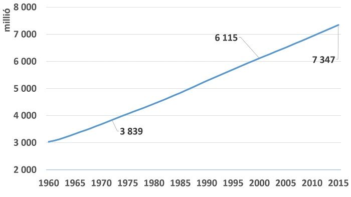 A Föld népességének növekedése. (1972, 2000, 2015 adatai kiemelve.)