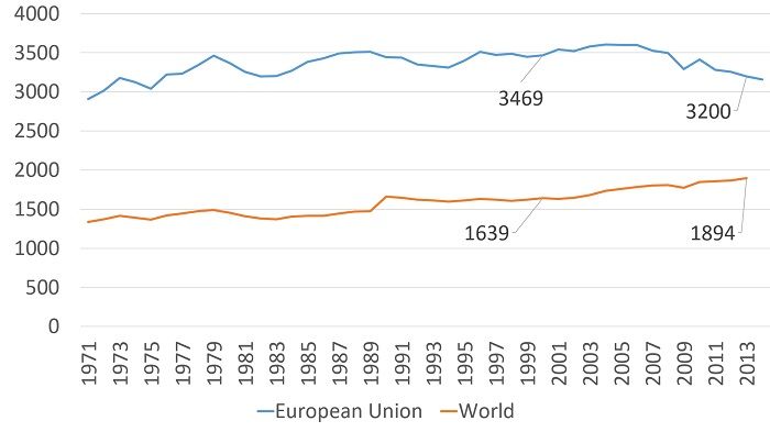Az EU és a világ energiafelhasználása, ezer kg olaj/főben kifejezve. (2000. és 2013. évek adatai kiemelve.)