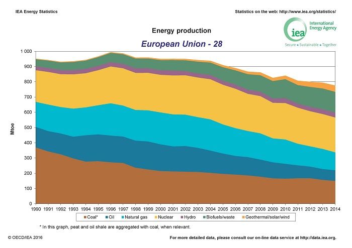 A Nemzetközi Energiaügynökség adatai szerint az EU összenergia-termelése a 90-es évek második fele óta csökken, ami a növekvő népesség és GDP fényében – igaz, ezt az utóbbi években visszaesések jellemzik – figyelemreméltó energiagazdasági teljesítmény.