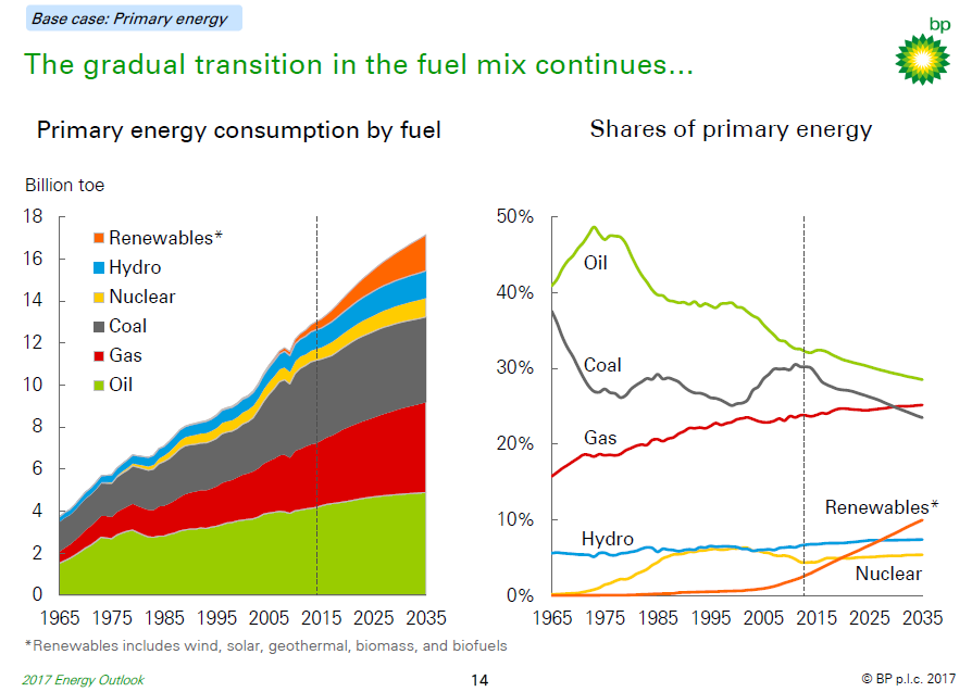 A BP által kiadott Energy Outlook 2017, ami 2035-ös kitekintéssel dolgozik, ugyanezen tendenciákat látja folytatódni, hozzátéve, hogy a gyors ütemben növekvő energiafogyasztás miatt a fosszilis energiahordozók iránti igény is nő, tehát szerepük a jövőben csak a teljes energiaigényhez viszonyítva fog csökkenni.