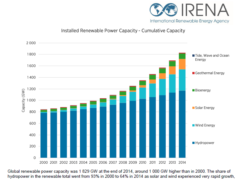 A globális megújulóenergia-kapacitás 2014 év végén 1829 GW volt, ami kb. 1000 GW-tal több mint 2000-ben.