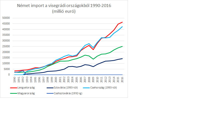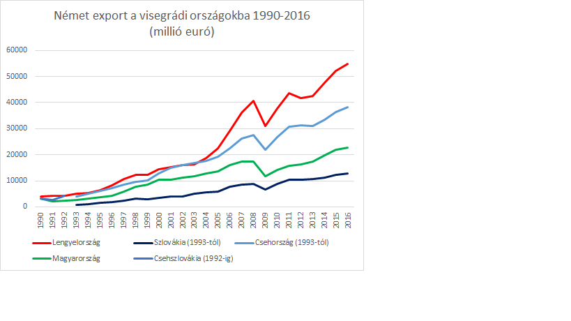 Az 1989-es rendszerváltás és a vasfüggöny lebontása új fejlődési távlatokat nyitott, az átmenetet azonban jelentősen megnehezítette a Szovjetunió, és ezzel párhuzamosan a korábbi exportpiacok összeomlása. Ami Németországot illeti, helyesebb a helyzetet egy sajátos közbenső állapotként leírni, ahol az ország régióban játszott gazdasági szerepe már és még nem volt tisztán kivehető. „Már”, hiszen az NDK és a régió közötti kereskedelem a KGST szétesésének köszönhetően gyakorlatilag megszűnt. A keletnémet export 94%-os csökkenése e tekintetben igen beszédes adat és egyúttal rávilágít arra is, milyen nehézségekkel kellett az egykori keleti blokk országainak megküzdeniük, hogy fél évszázados kihagyás után újra beilleszkedhessenek a nemzetközi gazdaság vérkeringésébe. A „még” megjegyzés ezzel szemben az NSZK kelet-közép európai gazdasági jelenlétének akkortájt tapasztalható hiányára utal. A német újraegyesítés azonban minden tekintetben változást hozott és lehetővé tette, hogy – a belső konszolidációval párhuzamosan – a visegrádi országok által igen rövid idő alatt bevezetett átfogó szabadpiaci reformoknak köszönhetően megindulhasson a kelet és nyugat közötti gazdasági integráció.